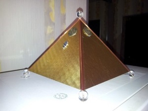 Сама Пирамида изготавливается из латунных (медно-никелевый сплав) пластин и имеет окантовку из чистой меди. На вершине и четырех углах основания пирамиды расположены хрустальные шары. На одной из своих сторон пирамида имеет четыре отверстия. Также внутри этой пирамиды расположена специальная капсула с излучающим агентом –«свидетелем» сделанным из пяти натуральных мягких восков. Излучающий «Агент» заряжен по специальной технологии на запатентованном оборудовании Владислава Викторовича Васильева автора-изобретателя из России.