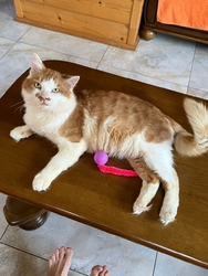Лёва еще совсем молодой кот, ему безумно интересны разные игрушки, удочки, мячики.
